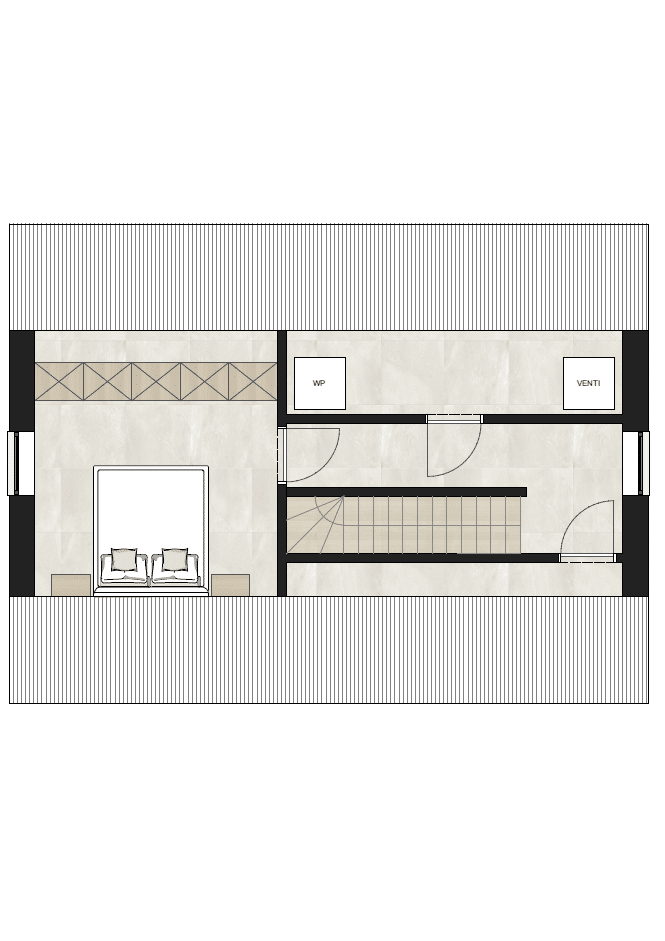 De zolderruimte van deze woning heeft een oppervlakte van 39 m² en is afgewerkt t.e.m. chape. Wil je deze ruimte graag verder inrichten, dan kan dat volgens ons uitgewerkt model.